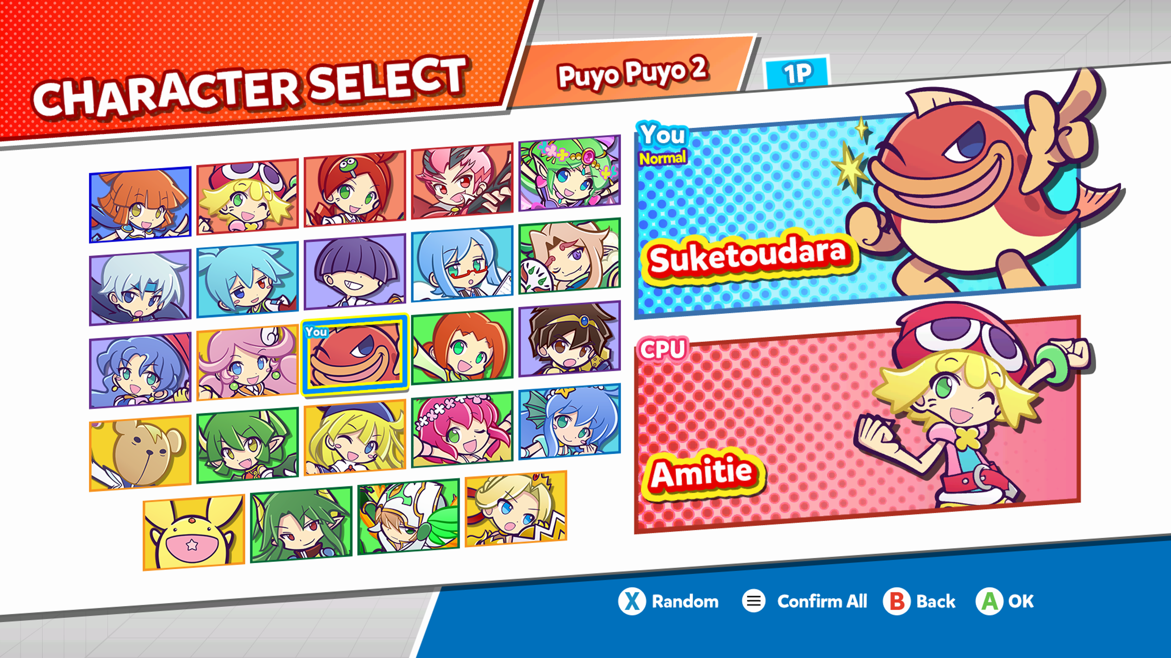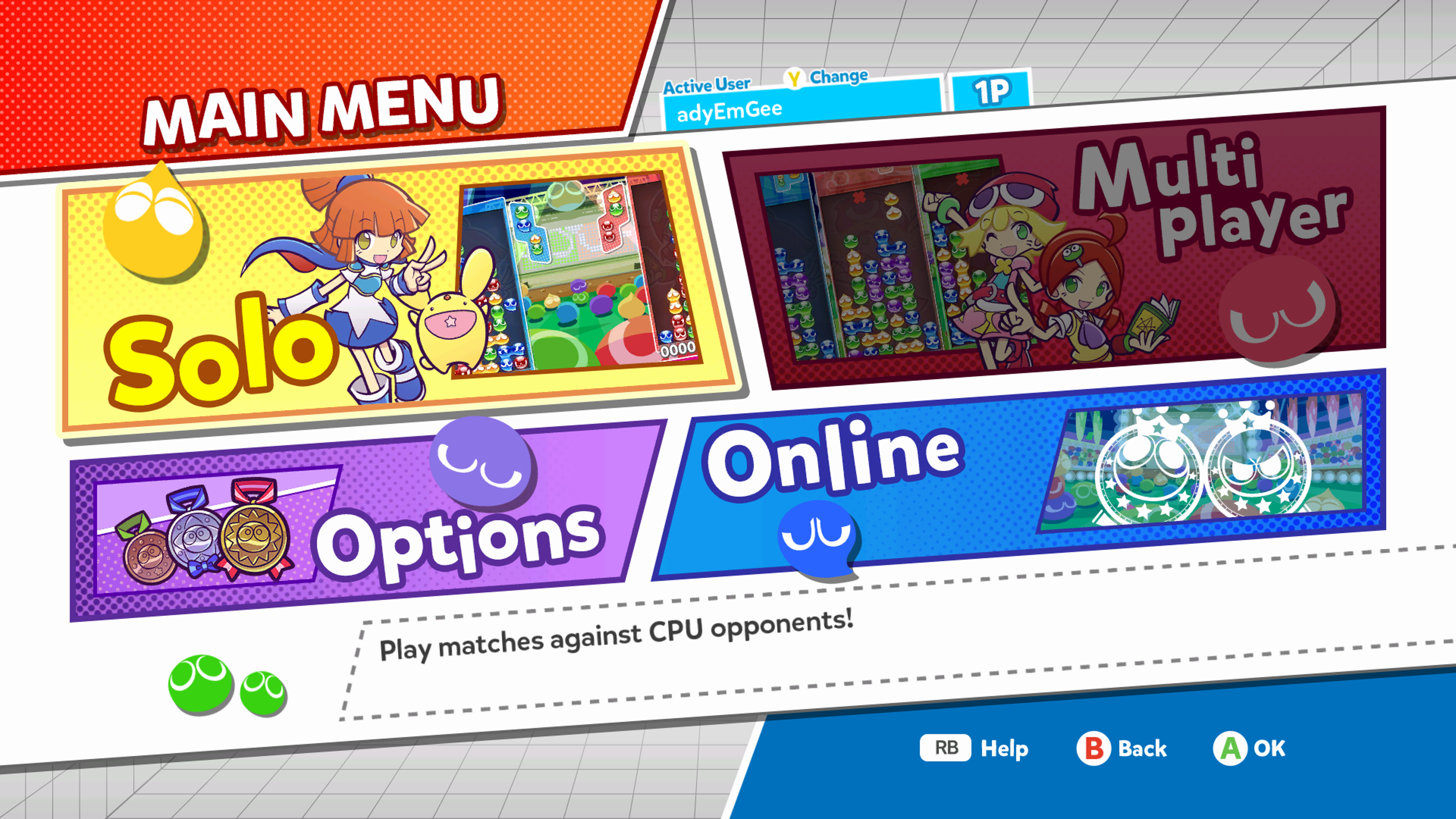 There are a wide range of customisation options available, including a vast choice of characters, level, game length, etc, so you can customise how you want to play. There didn’t seem to be a difficulty setting as such, but instead there is a handicap setting, which on its easiest setting gives you in-game pointers on what to do, and at it’s hardest will result in random garbage Puyo’s dropping. Again, for a newcomer this was really confusing and hidden, and there was a lot of trial and error in working it out. A top-level difficulty setting is really needed.