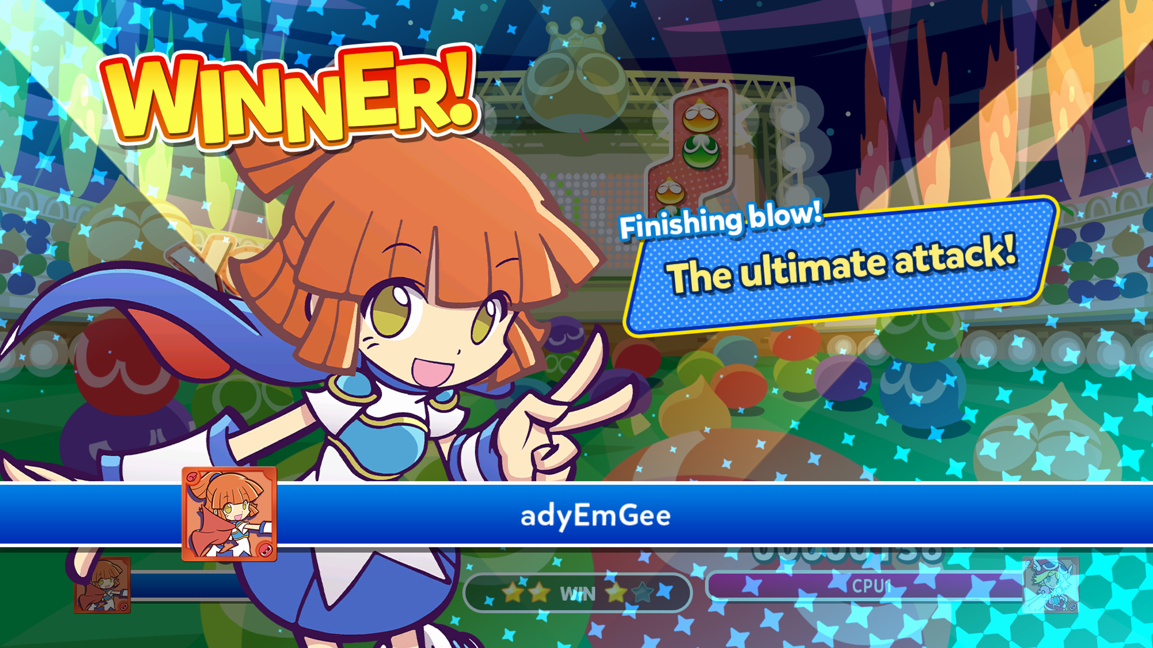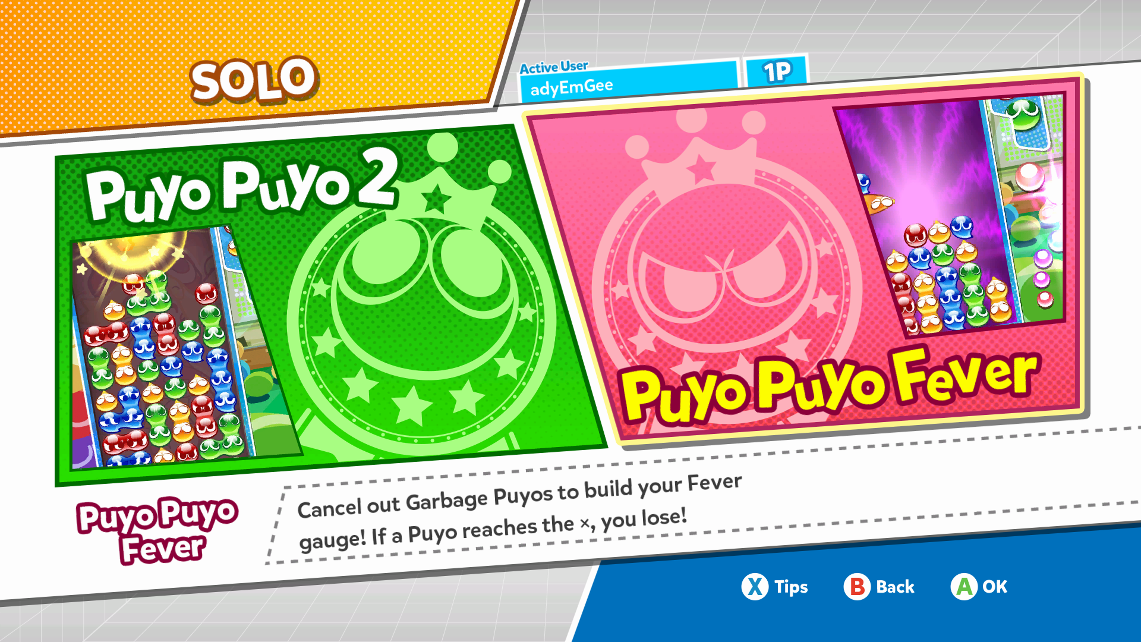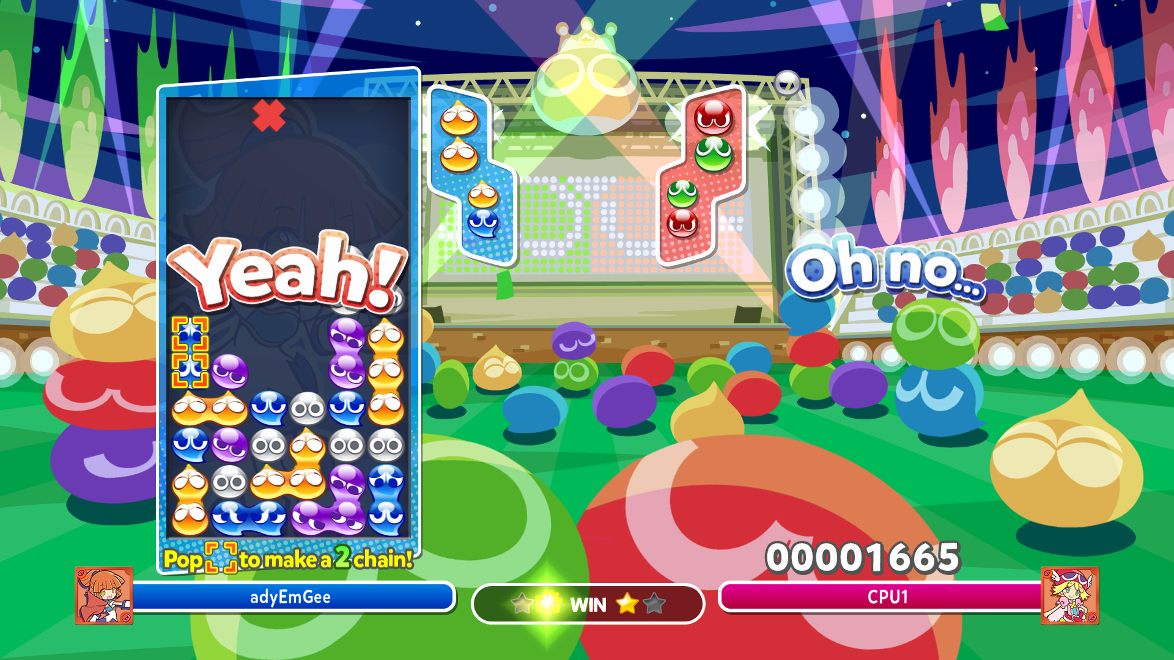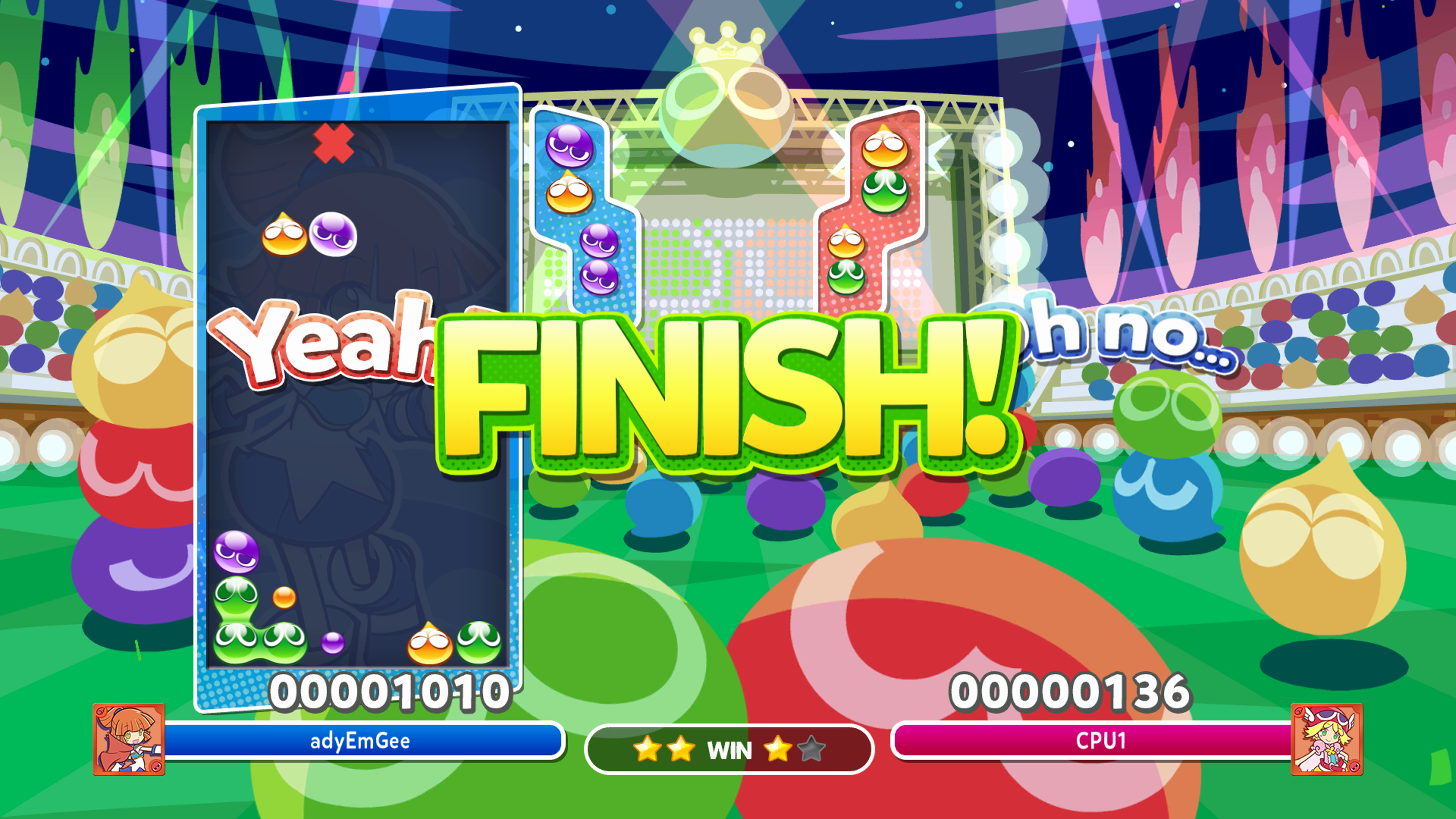 But down to my core experience of the game, and it was a mixed bag. On one hand I really enjoyed the gameplay, and the more I played, the more I learnt and improved, and soon found my way working up to creating a few chains and found myself winning some matches. But, at times it was also frustratingly unfair. On occasions I was planning ahead, laying my Puyo’s in such a way as to create a large chain, and then the CPU opponent would create their own large chain and fill my area with garbage, and win the game. It was all too quick for me to react, and it did feel that the AI was just too perfect in their ability. Playing online also made me feel incredibly inadequate, as most players on here were very skilled and ruthless.