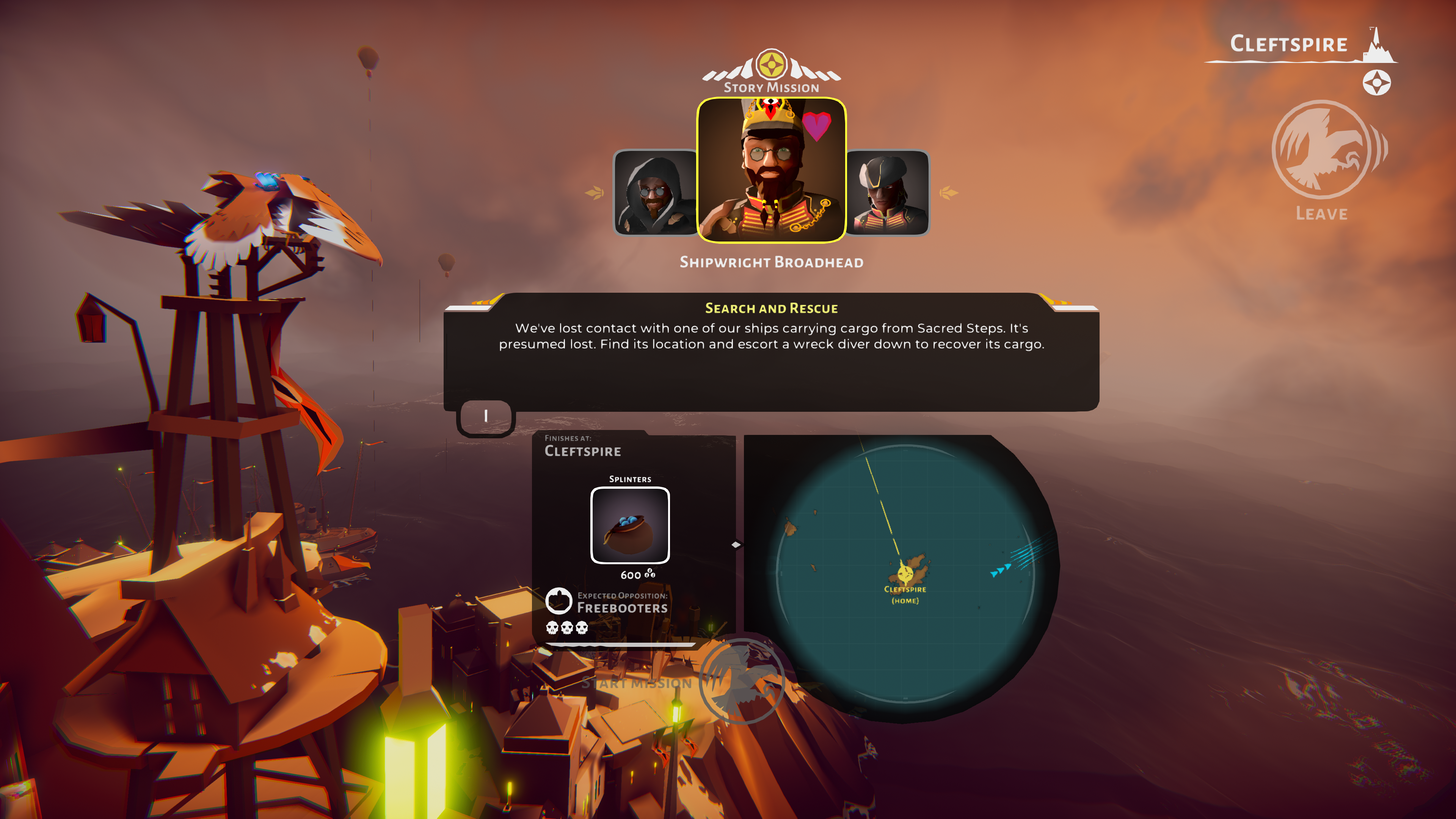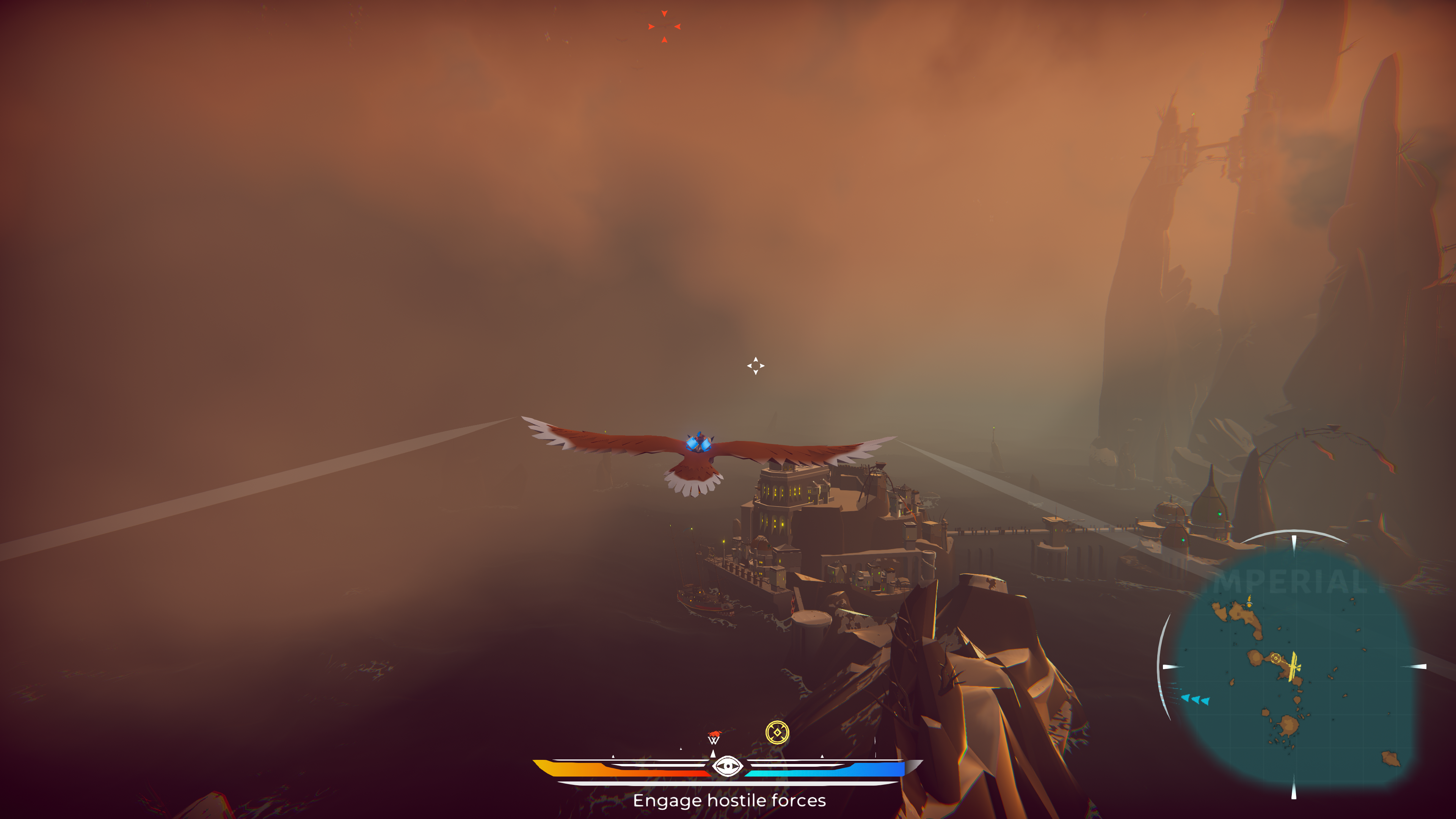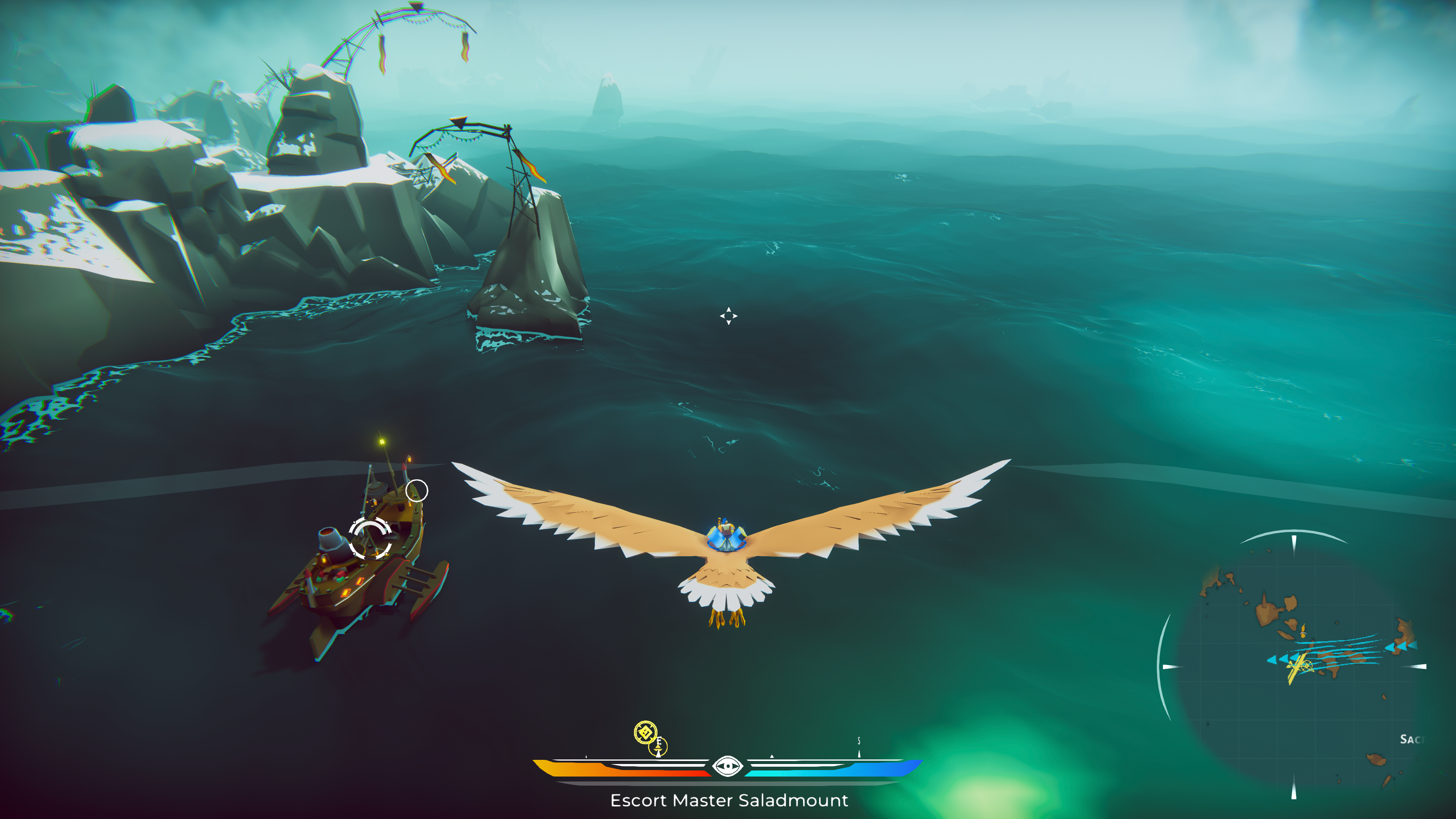 Gameplay wise, as previously mentioned, The Falconeer is an aerial dogfighting combat game. You will be spending the majority of time flying your falcon around the world, shooting enemy falcons, birds and boats. I must admit, the game mechanics took a while to gel for me, and early on I was getting incredible frustrated following the story path, as I was easily getting defeated in combat. A quick Google search uncovered others who had found the same, and a tip from them was to veer from the story and complete the side missions, which in turn earned your character some extra Splinters (cash), which allowed the upgrade of your weapons and health. Your home settlement will provide an endless stream of these missions, however, different settlements can also provide them, as long as you have a permit to land there, or if you are not at war with that particular faction! Although not signposted in the game, this process was essential to make progress. I can see how some gamers may have been put-off when trying to complete the story missions with such an underpowered character.