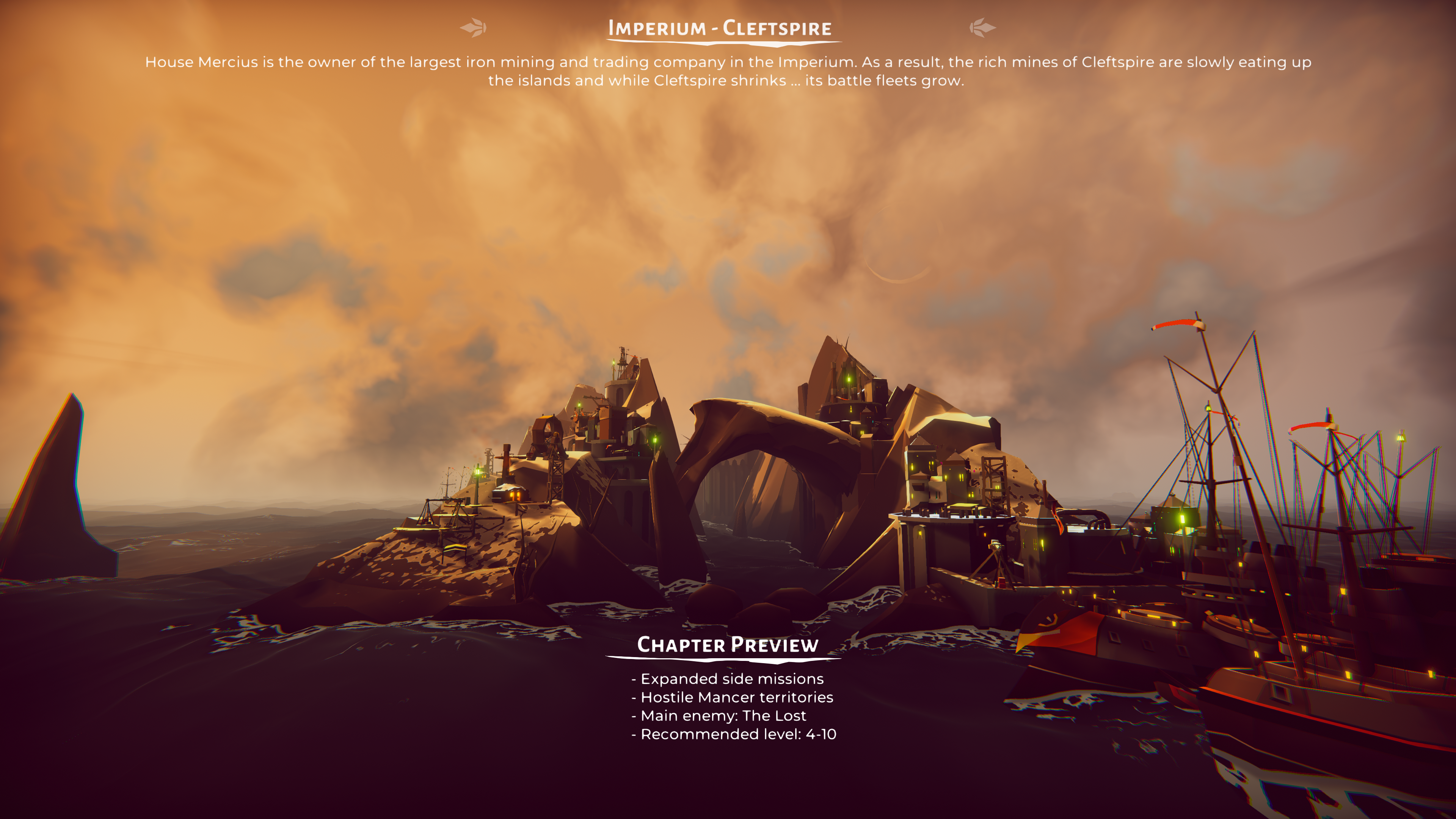 The Falconeer is set in a fantasy ocean world known as the Great Ursee. The Great Ursee is made up of a number of different regions, all split between five warring factions: the Mancers, the Freebooters, the Imperium, the Civilians, and Rogue Pirates. Each of these factions has its own unique goals, strengths and weaknesses. The Falconeer contains a number of different chapters within the story, for example, the starting chapter pits you as a Civilian, and tells the story of how your settlement of Dunkle sides with the Imperium faction in order to survive and prosper. Further chapters then see you representing the other factions with differing enemies, objectives and outcomes. On average it has been quoted that the game can be completed in roughly 10 hours, however I believe that there is a lot more content to be had than that.